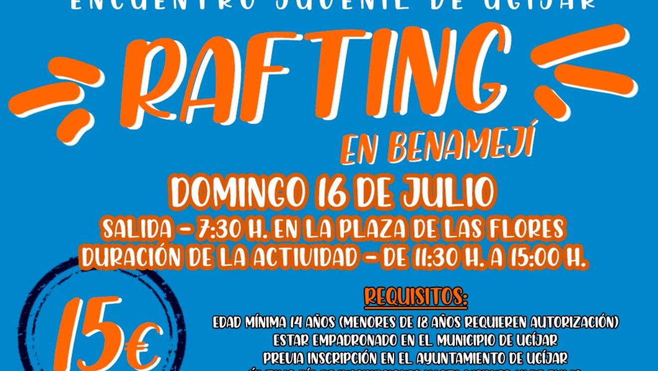 Os recordamos que el próximo domingo 16 de julio, tendrá lugar un #EncuentroDeJóvenes en el #RioGenil para realizar la actividad de #Rafting, la salida será a las 7:30 h. desde la #PlazaDeLasFlores la duración de la actividad será desde las 11:30 h. hasta las 15:00 h. aproximadamente.